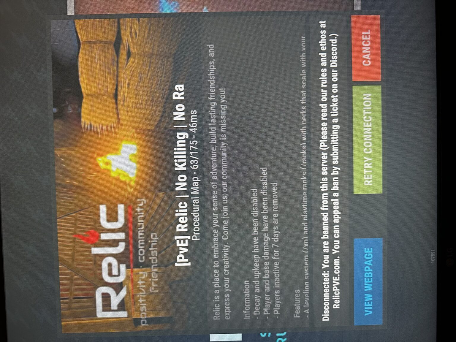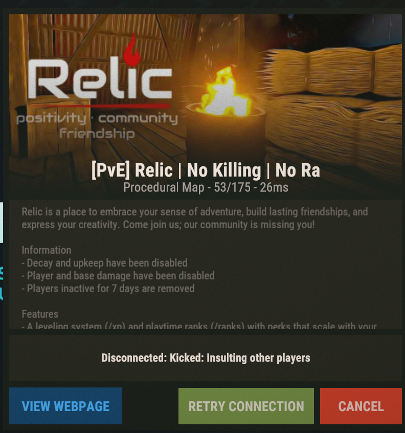 I just want to play Relic again, I spent a large chunk of my time on the server, and it was always a relaxing experience. I had no previous infractions to that point and I practically only play solo, and stay out of everyone's hair for the most part.