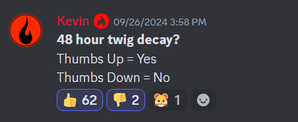 - Twig now has a 48 hour decay. Please be sure to upgrade your pieces to wood, stone, metal or HQM (these grades won't decay, it's only twig). We ran a poll on our Discord with overwhelming support of this change. This will help reduce lag around the map :).